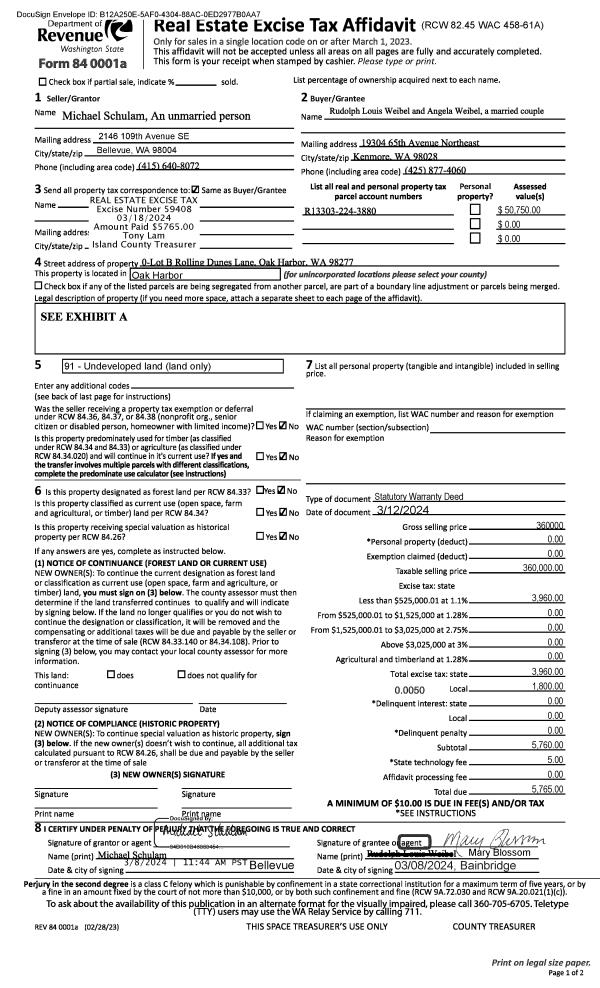 | 1 | 06/30/2000 | WD | Warranty Deed | LANGE TRUSTEE, RICHARD J | ISLAND COUNTY, | | | $39,250.00 | 2657 | 20012538 |