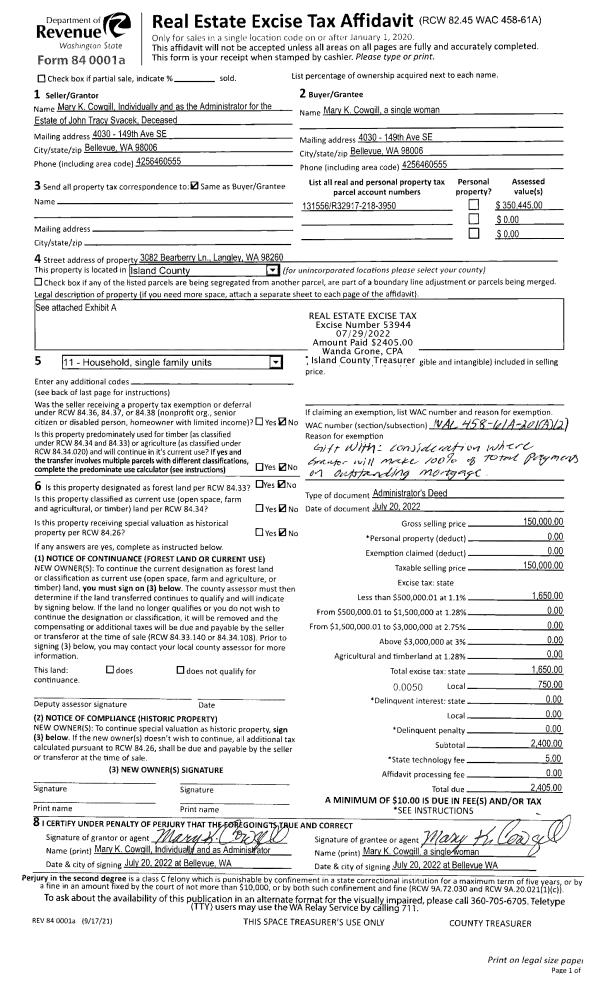 | Mailing Address: | 2282 FAIRWAY LN OAK HARBOR, WA 98277 | % Ownership: | 100.0000000000% |