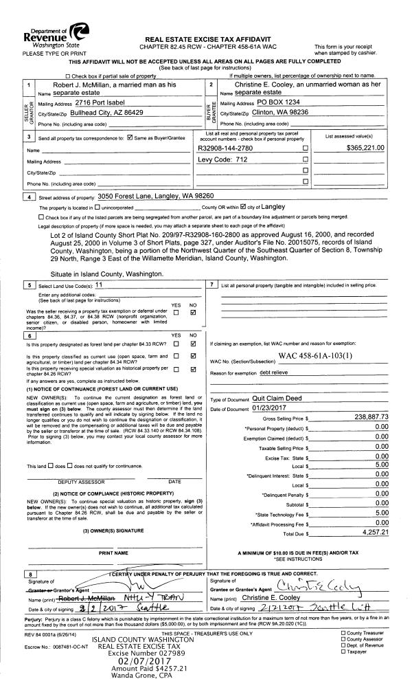 | Mailing Address: | MICHELLE PEARSON 1162 SHERWOOD LN GREENBANK, WA 98253 | % Ownership: | 100.0000000000% |