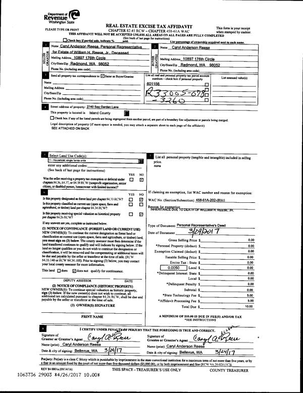 | Mailing Address: | CANDICE L PEDERSEN 385 W CROSS ISLAND RD CAMANO ISLAND, WA 98282 | % Ownership: | 100.0000000000% |