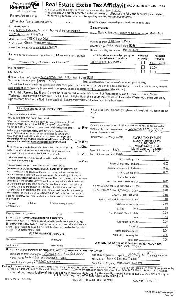 | Mailing Address: | 381 E RAINTREE LN CAMANO ISLAND, WA 98282 | % Ownership: | 100.0000000000% |