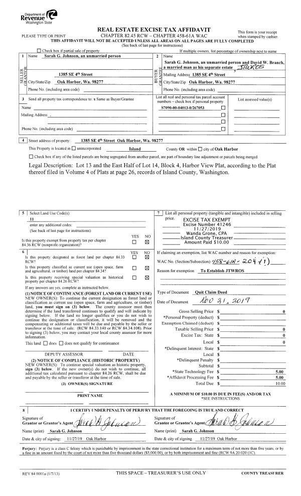 | 3 | 12/21/1999 | QCD | Quit Claim Deed | SIMMONS, ROGER L | TEDDY'S ON WHIDBEY INC, | | | $18,305.00 | 95159 | 99028723 |