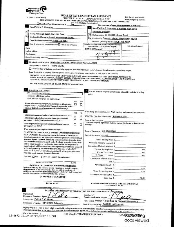 | 2 | 06/07/2019 | PRD | Personal Representatives Deed | DE CLERCQ, AGNES H. H. | DECLERCQ, AGNA H H | | | $0.00 | 38914 | 4465148 |