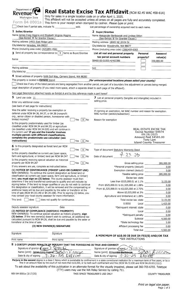| Mailing Address: | TIMOTHY DANIEL QUINN 992 WALKER HEIGHTS PL OAK HARBOR, WA 98277 | % Ownership: | 100.0000000000% |