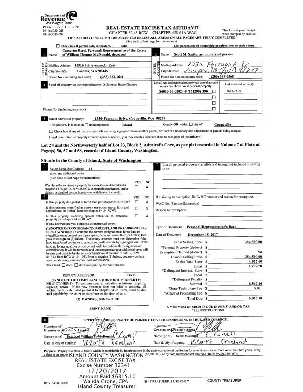 | 1 | 01/11/2018 | PRD | Personal Representatives Deed | MYERS, REBECCA J | WHIDBEY ANIMALS IMPROVEMENT FOUNDATION, | | | $675,000.00 | 32584 | 4437348 |