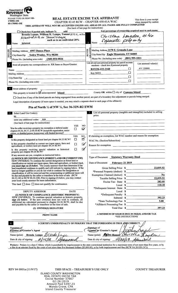 | Mailing Address: | JEANNIE MAURER 2629 SANDY DR CAMANO ISLAND, WA 98282 | % Ownership: | 100.0000000000% |
