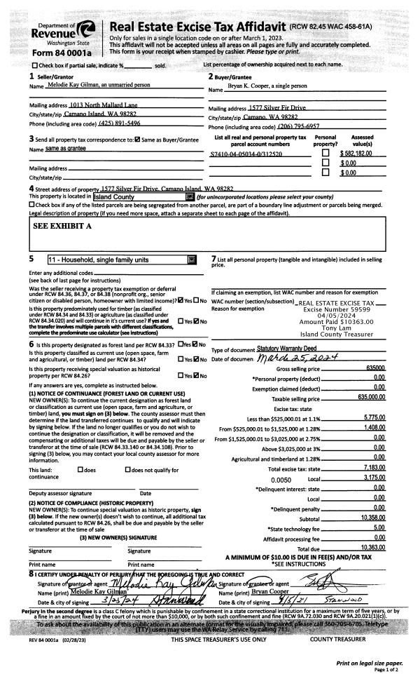 | 1 | 09/18/2024 | EZ | Easement | WHIDBEY CAMANO LAND TRUST | WHIDBEY CAMANO LAND TRUST | | | $1,250,000.00 | 61344 | 4577369 |