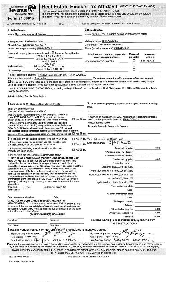 | Mailing Address: | 665 LORIEN LN CAMANO ISLAND, WA 98282 | % Ownership: | 100.0000000000% |
