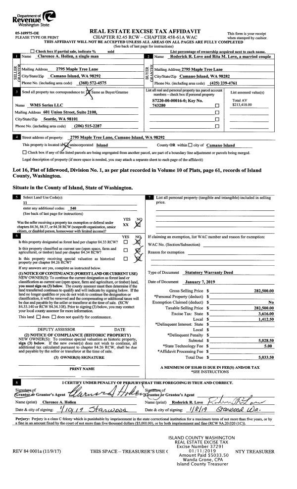 | Mailing Address: | 7763 SUMMIT VIEW LN CLINTON, WA 98236 | % Ownership: | 100.0000000000% |