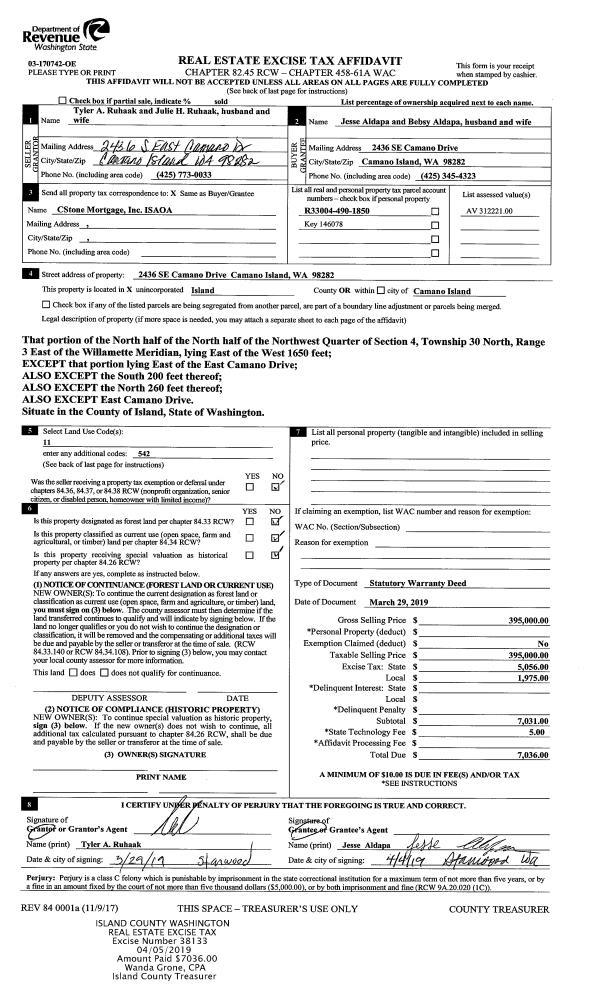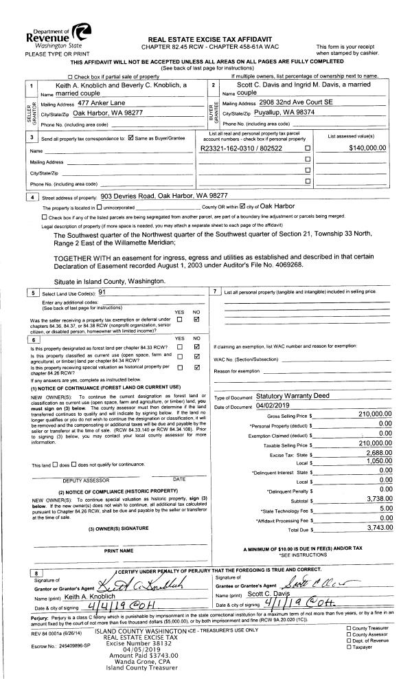 | Mailing Address: | 2180 WESTWOOD PL OAK HARBOR, WA 98277 | % Ownership: | 100.0000000000% |