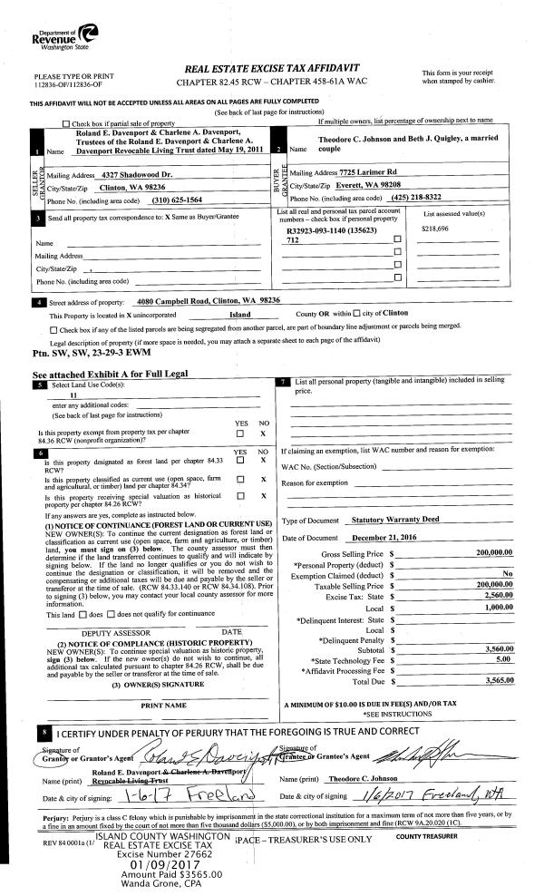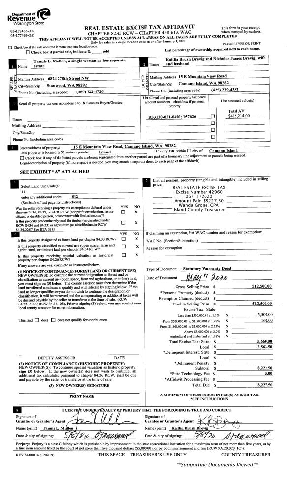 | Mailing Address: | TREVA L TREMBLAY 24810 STATE ROUTE 525 GREENBANK, WA 98253 | % Ownership: | 100.0000000000% |