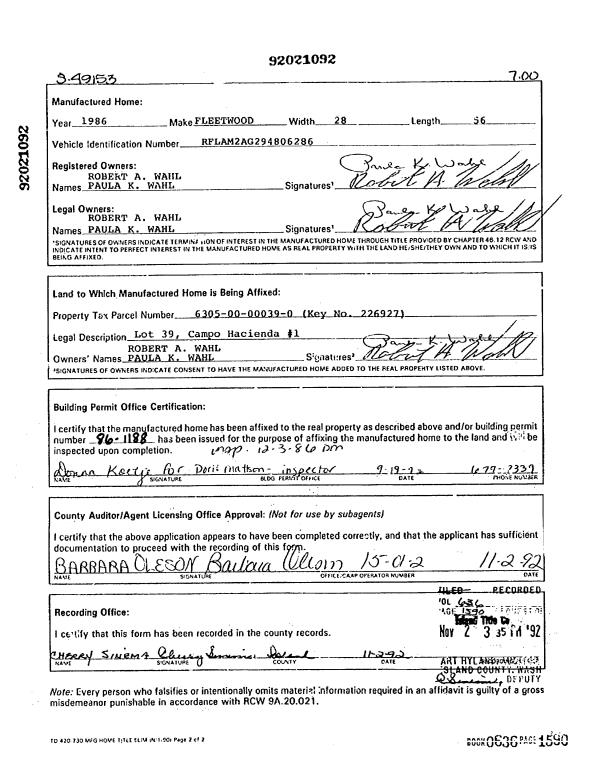 | Mailing Address: | 700 NW CROSBY AVE TRLR 195 OAK HARBOR, WA 98277 | % Ownership: | 100.0000000000% |