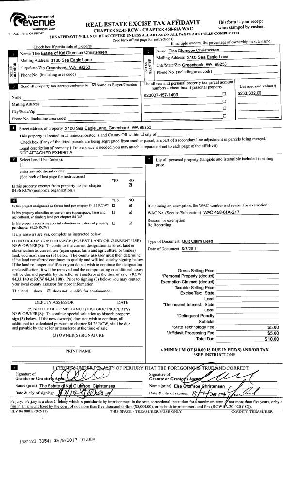 | Mailing Address: | CASIE J GREVE 5547 TARA DR FREELAND, WA 98249 | % Ownership: | 100.0000000000% |