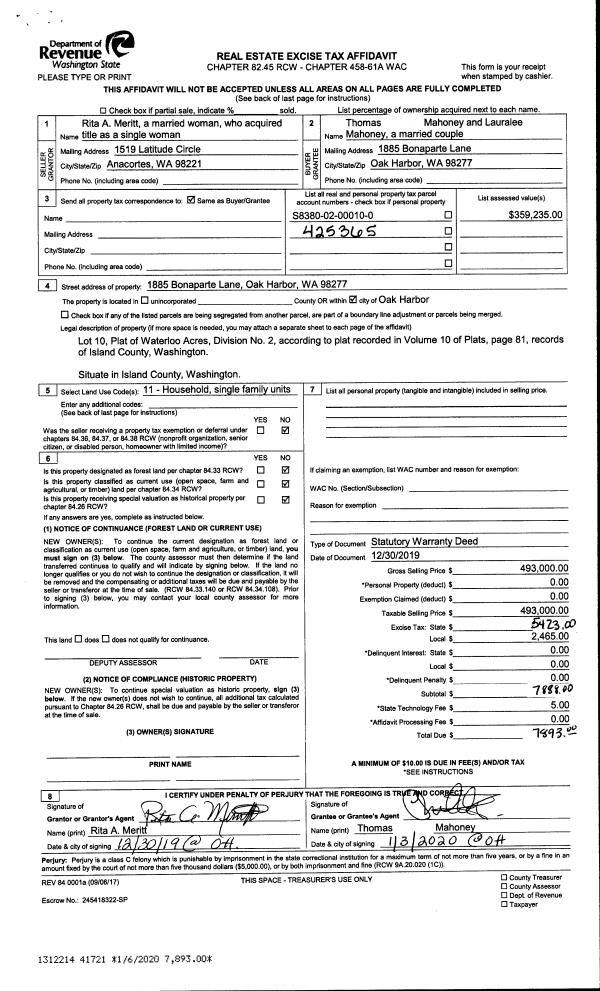 | Mailing Address: | SHAYLEE E OLNEY 713 SW LONDON TERRACE OAK HARBOR, WA 98277 | % Ownership: | 100.0000000000% |