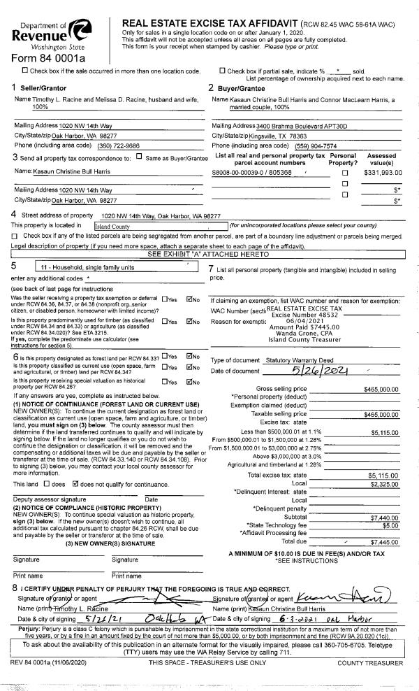 | Mailing Address: | 537 NE ELLIS WAY, UNIT A201 OAK HARBOR, WA 98277 | % Ownership: | 100.0000000000% |