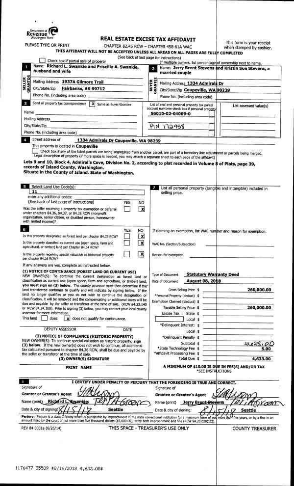 | Mailing Address: | KELSIE N WALKER 375 SW MUZZALL ST OAK HARBOR, WA 98277 | % Ownership: | 100.0000000000% |