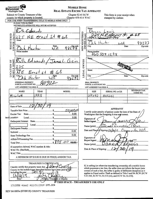 | 1 | 12/06/2019 | MANHOME | Manufactured Home | M BOE FAMILY, LLC | CAMACHO, BELLA | | | $3,500.00 | 49409 | |