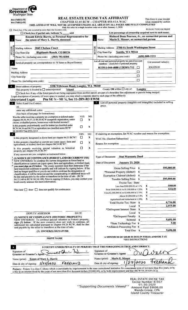 | Tax Area: | 719 - APPRAISER-S Whid Schl Dist, outside Langley, vacant & 50 acres or less | Land Use Code | 91 |
