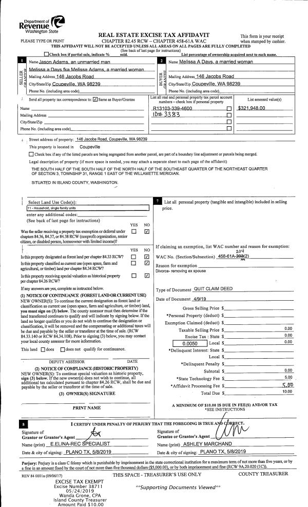 | 3 | 01/10/2019 | QCD | Quit Claim Deed | SKINNER TRUSTEE, MARCIA LEE | SKINNER, CHRIS | | | $0.00 | 37316 | 4457919 |