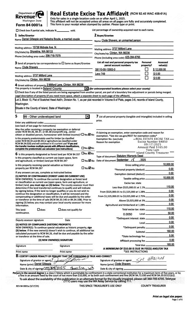 | Mailing Address: | 762 INDIAN BEACH RD CAMANO ISLAND, WA 98282 | % Ownership: | 100.0000000000% |