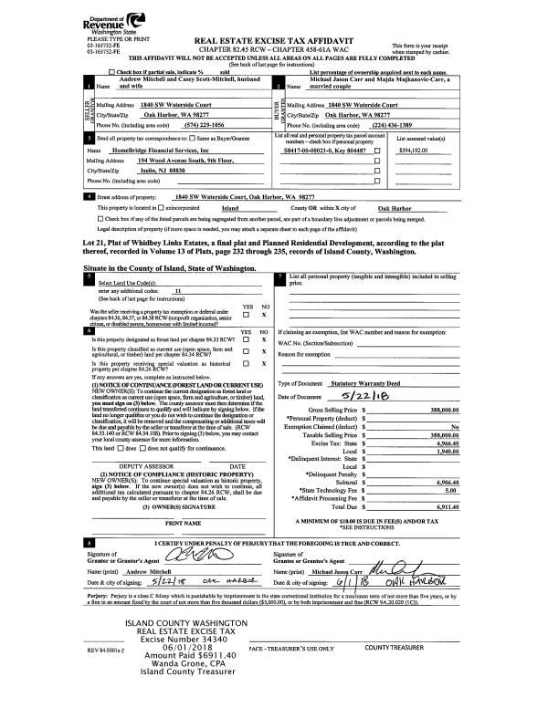 | 2 | 09/07/2018 | SPWARDEED | Special Warranty Deed | BARNUM CO-TRUSTEES, ROBERT D / GERALDINE | ISLAND COUNTY | | | $1,100,000.00 | 35874 | 4451642 |