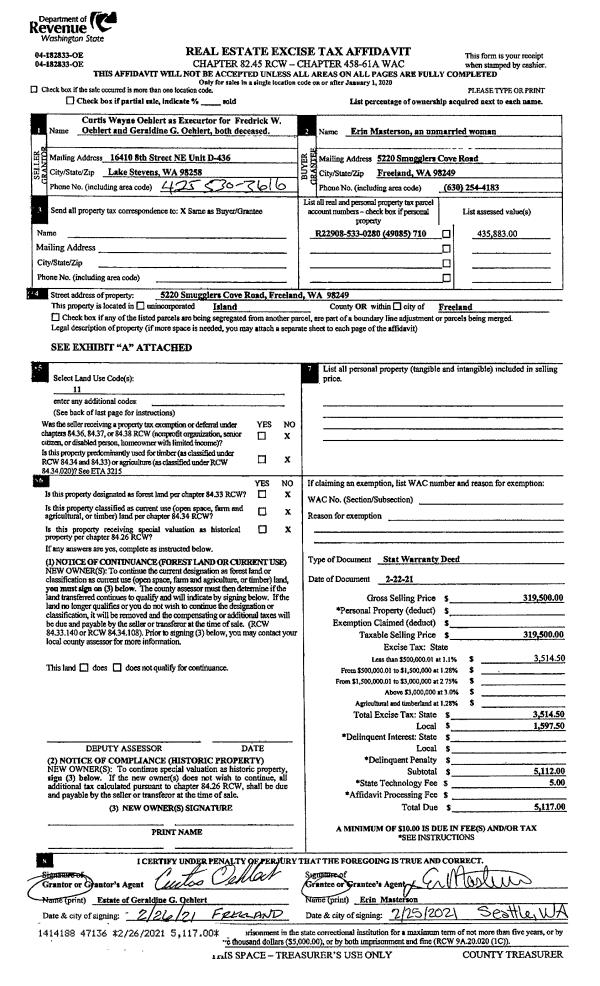 | Mailing Address: | JOSEPHINE MOCCIA 7440 EAGLE GLEN LN CLINTON, WA 98236 | % Ownership: | 100.0000000000% |