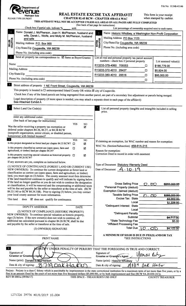 | 1 | 04/10/2019 | WD | Warranty Deed | HISTORIC WHIDBEY | HISTORIC WHIDBEY | | | $0.00 | 39776 | 4468939 |