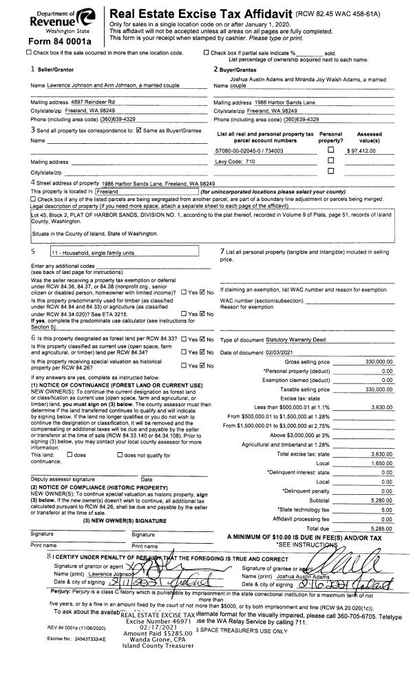 | Tax Area: | 712 - APPRAISER-S Whid Schl Dist, outside Langley, improved, greater than 1 acre | Land Use Code | 11 |