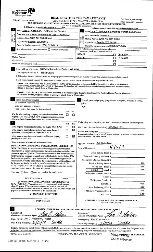 | Mailing Address: | 1523 CAROL ST CAMANO ISLAND, WA 98282 | % Ownership: | 100.0000000000% |