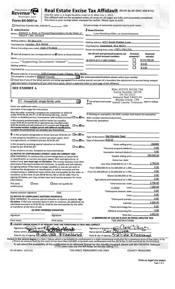 | Mailing Address: | SAMANTHA STUEHLER 2762 SUN VISTA CIRCLE CLINTON, WA 98236 | % Ownership: | 100.0000000000% |