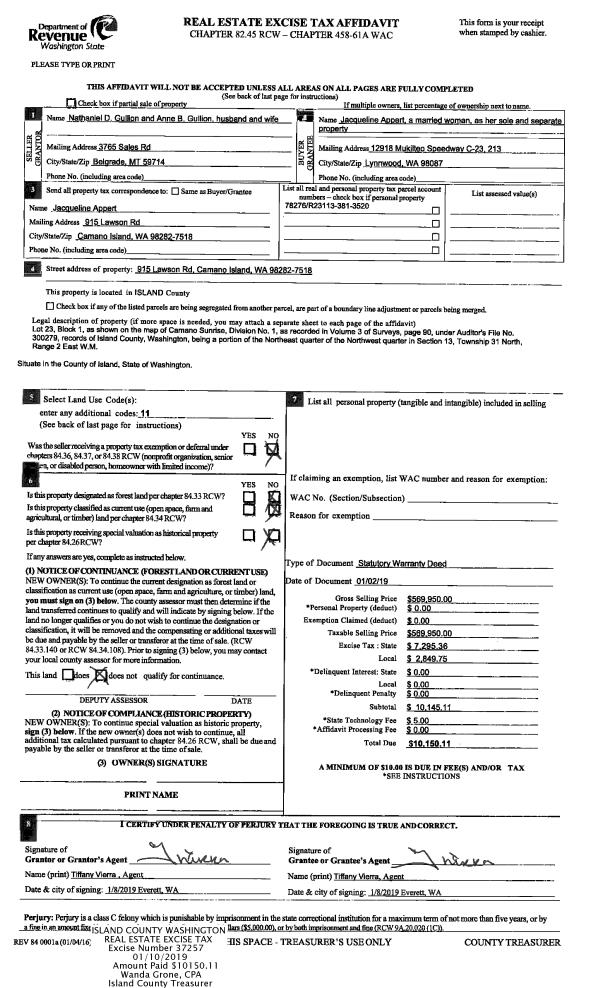 | Mailing Address: | DENISE ADELE DEGUTIS 303 DOVE DRIVE CAMANO ISLAND, WA 98282 | % Ownership: | 100.0000000000% |