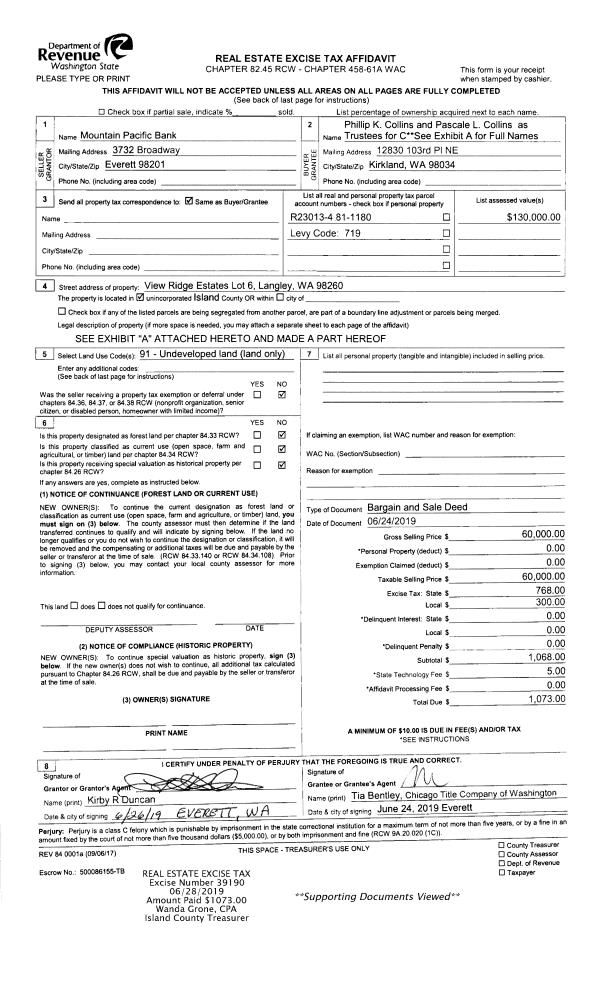 | 4 | 07/23/2019 | MANHOME | Manufactured Home | WHIDBEY RE VENTURES, LLC | BOURDON, ADONIS J | | | $20,000.00 | 39511 | |