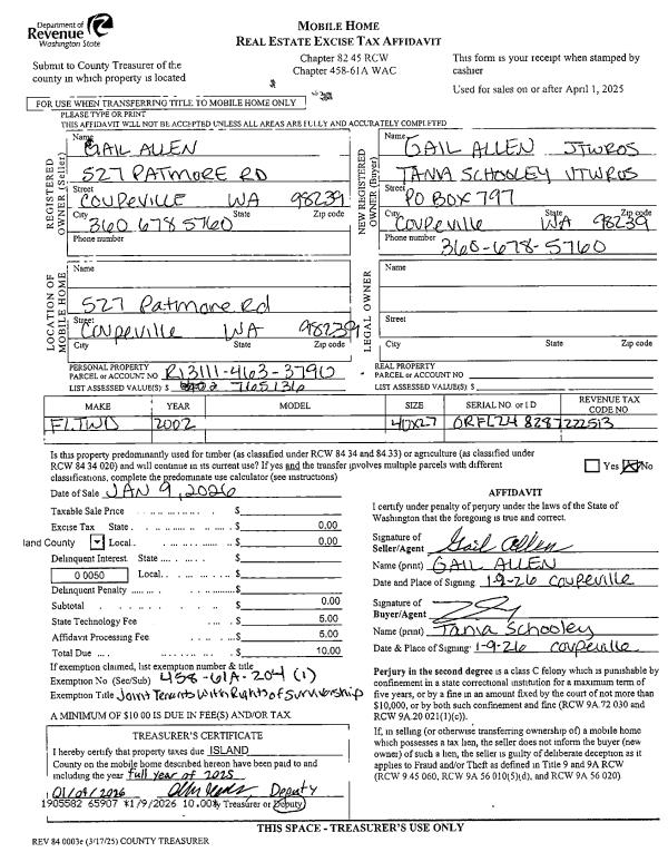 | Mailing Address: | 701 S MAIN ST #55 COUPEVILLE, WA 98239 | % Ownership: | 100.0000000000% |