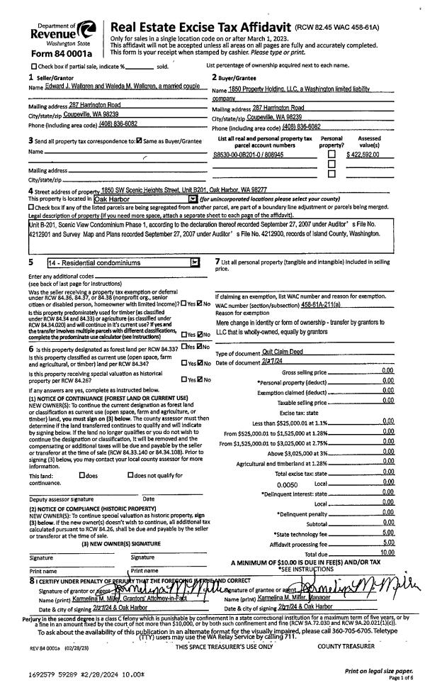 | Mailing Address: | SHARON F KOORN 604 NW LATEEN ST OAK HARBOR, WA 98277 | % Ownership: | 100.0000000000% |
