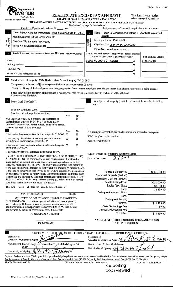 | 3 | 10/07/2020 | EZ | Easement | LUXENBERG, GRETCHEN | WHIDBEY CAMANO LAND TRUST | | | $50,300.00 | 45238 | 4499474 |