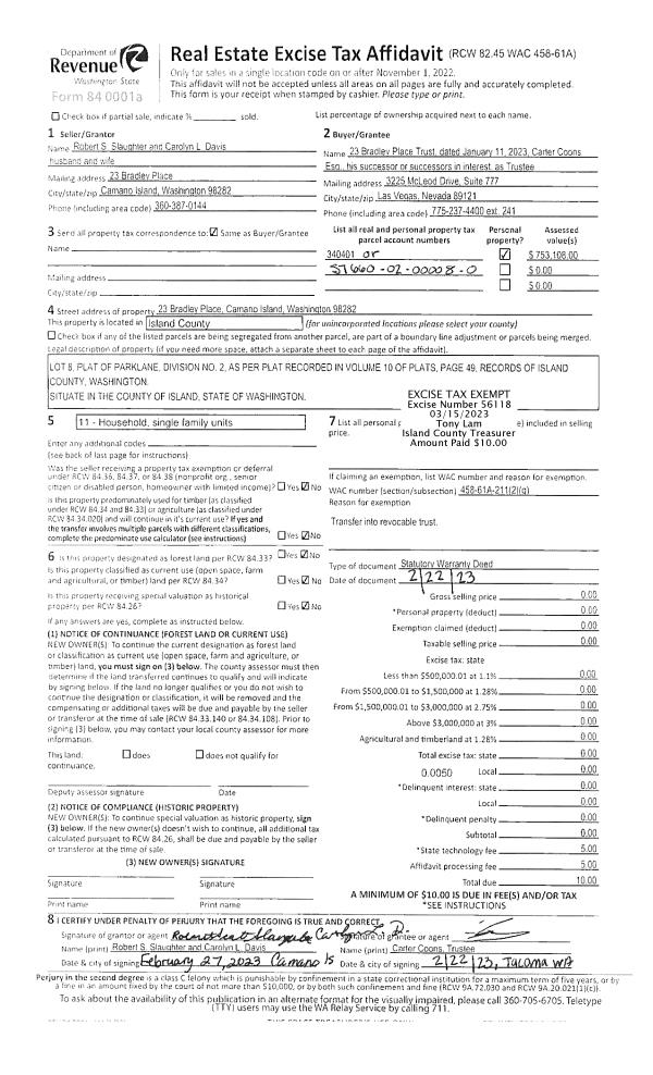 | Mailing Address: | 3193 GREEN RD OAK HARBOR, WA 98277 | % Ownership: | 100.0000000000% |