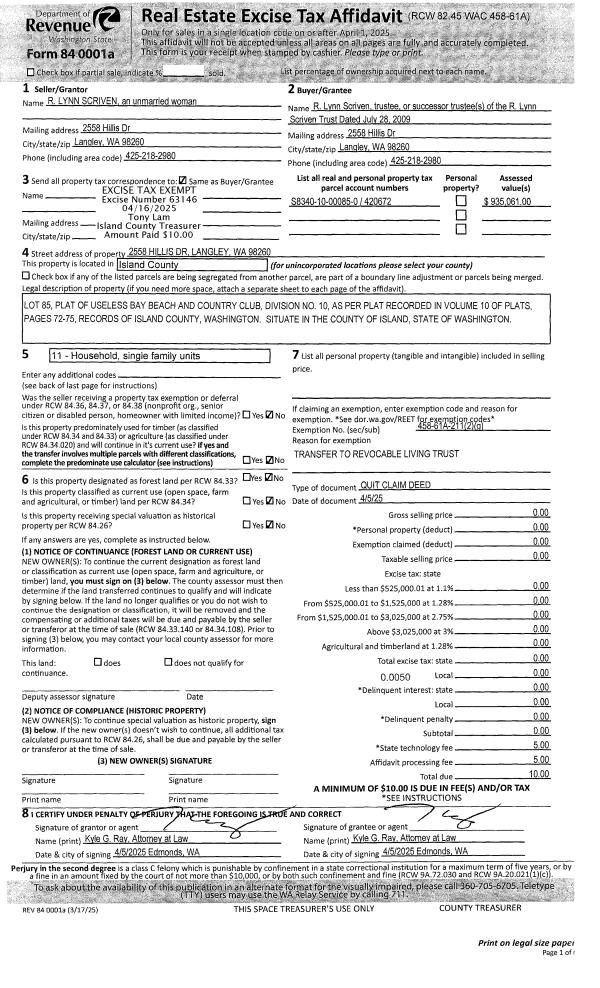 | Mailing Address: | 447 STILLMEADOW RD COUPEVILLE, WA 98239 | % Ownership: | 100.0000000000% |
