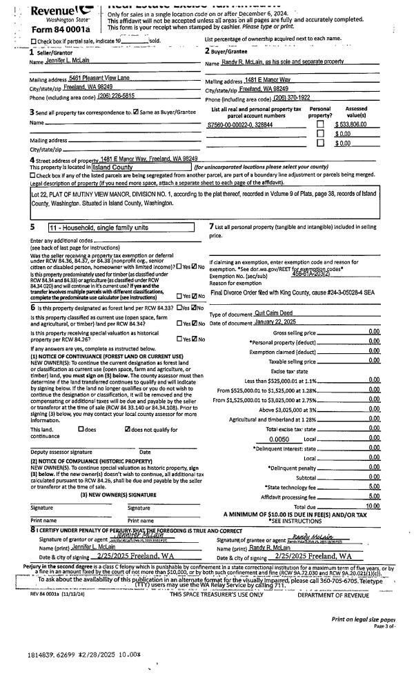 | Mailing Address: | 240 KINGFISHER LN COUPEVILLE, WA 98239 | % Ownership: | 100.0000000000% |