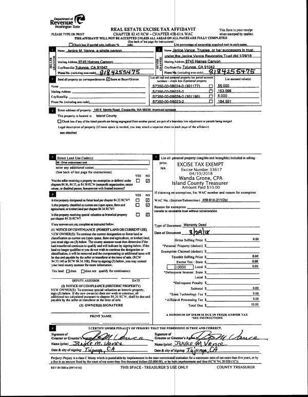 | 1 | 11/21/2017 | QCD | Quit Claim Deed | WINDLE, MACK R | CAMANO COUGAR RANCH, LLC | | | $0.00 | 32959 | 4439291 |