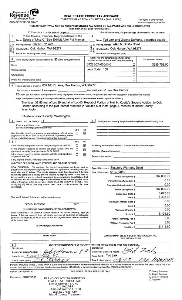 | 1 | 04/29/2019 | WD | Warranty Deed | ALLITO PROPERTIES LLC | ISLAND COUNTY | | | $45,000.00 | 38432 | 4462982 |