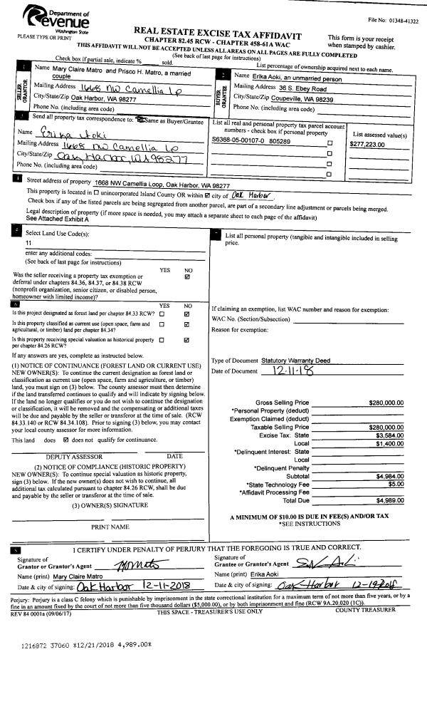 | Mailing Address: | KAYLA HATCH 1054 SW THORNBERRY DR OAK HARBOR, WA 98277 | % Ownership: | 100.0000000000% |