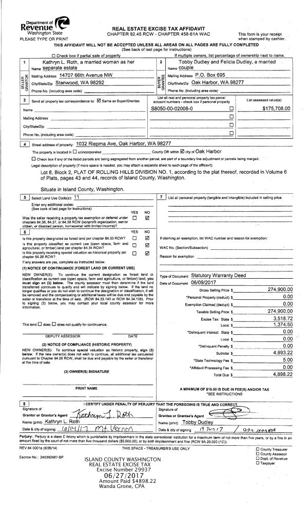 | NWHIDPRMT | P & R N Whidbey GEN | 0.2004466701 | $490,000 | $490,000 | $98.22 | | |