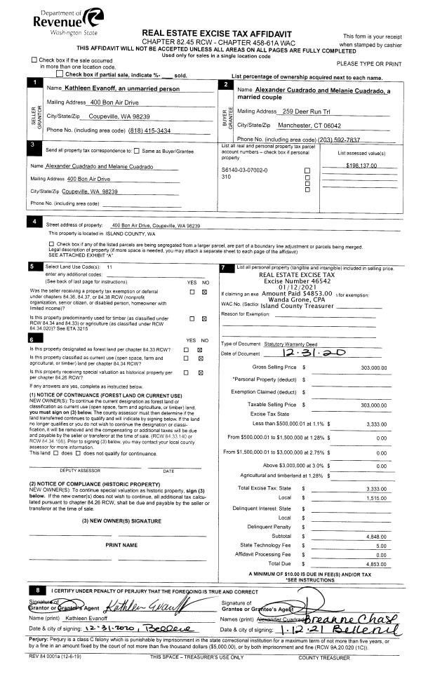 | Mailing Address: | MELINDA C BENJAMIN 5504 SUNNYSIDE PL UNIT 41 FREELAND, WA 98249 | % Ownership: | 100.0000000000% |