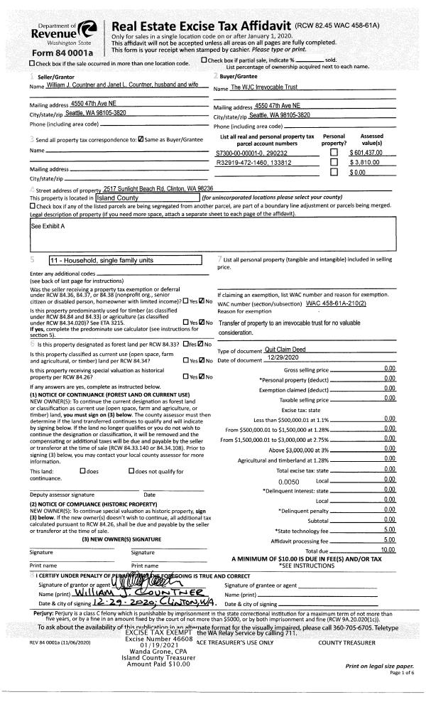 | 1 | 08/28/2020 | WD | Warranty Deed | MENZER, ARTHUR H | ISLAND COUNTY PUBLIC WORKS | | | $0.00 | 45133 | 4498819 |