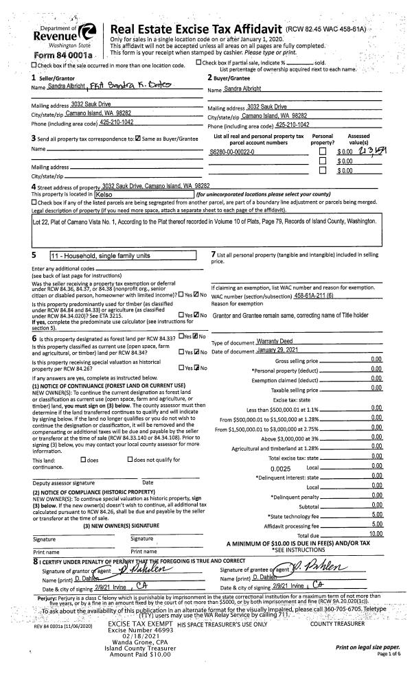 | Mailing Address: | DONALD KERNS 572 CHESTNUT LN CAMANO ISLAND, WA 98282 | % Ownership: | 100.0000000000% |