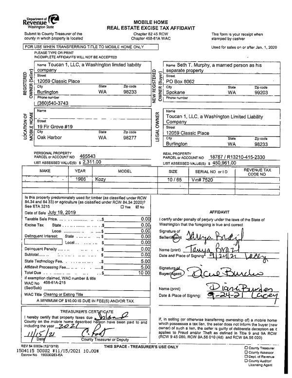 | Mailing Address: | 4428 POINT VIEW WALK LANGLEY, WA 98260-9598 | % Ownership: | 100.0000000000% |