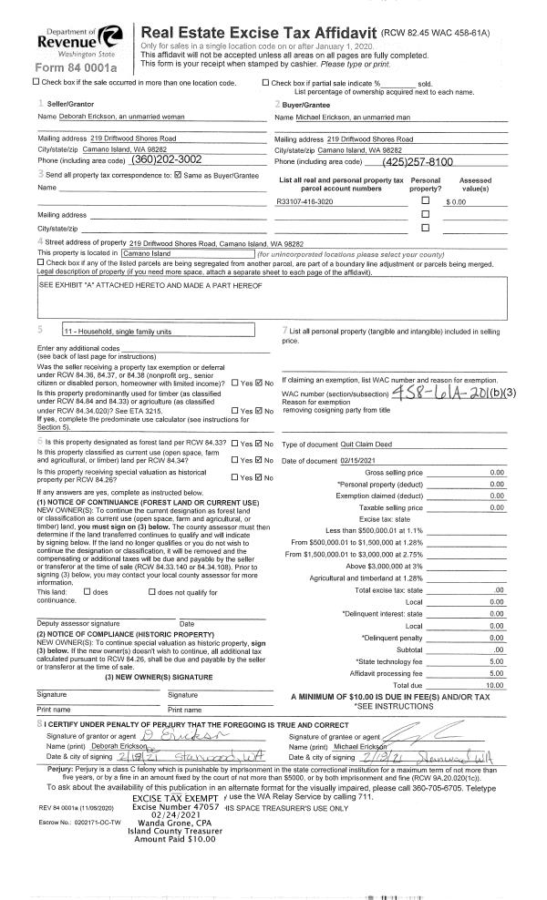 | Mailing Address: | DANIEL E ERICKSON 595 E MOUNTAIN VIEW RD CAMANO ISLAND, WA 98282 | % Ownership: | 100.0000000000% |
