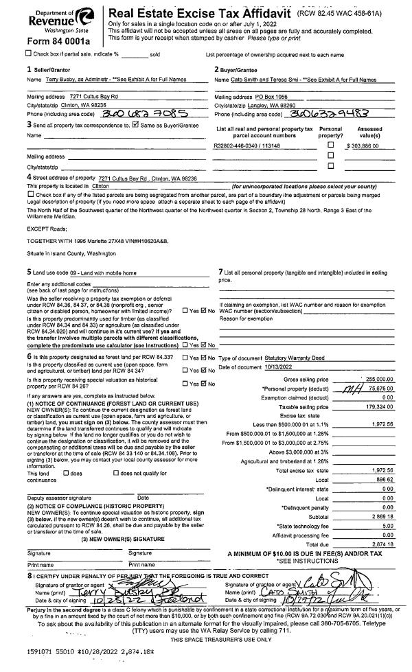 | 1 | 06/05/2025 | WD | Warranty Deed | SOUNDVIEW WHIDBEY REALTY, LLC | CLEMENTS, GREYSON | | | $170,000.00 | 63713 | 4586713 |