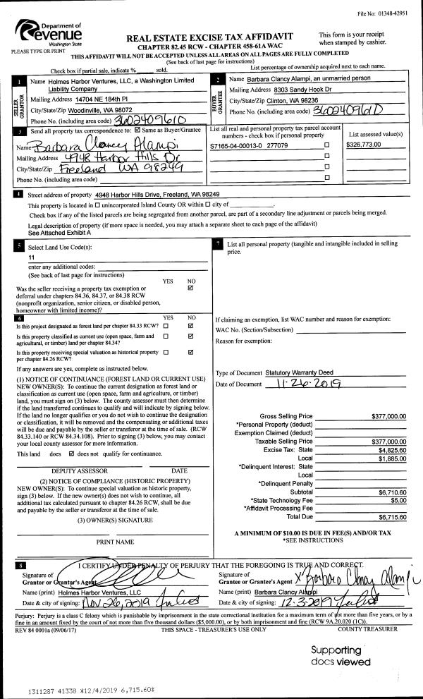 | 1 | 12/21/2009 | TRUSTEED | Trustee's Deed | DOGWOOD WHIDBEY DEVELOPMENT LL | FREELAND WATER AND SEWER DISTR | | | $1,008.00 | 93197 | 4266236 |