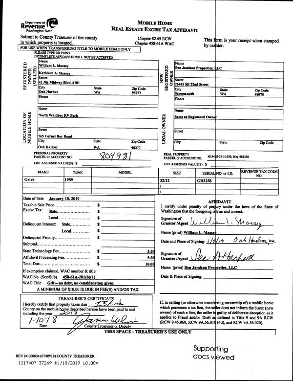 | Mailing Address: | 1670 SW MULBERRY PL UNIT B-301 OAK HARBOR, WA 98277 | % Ownership: | 100.0000000000% |